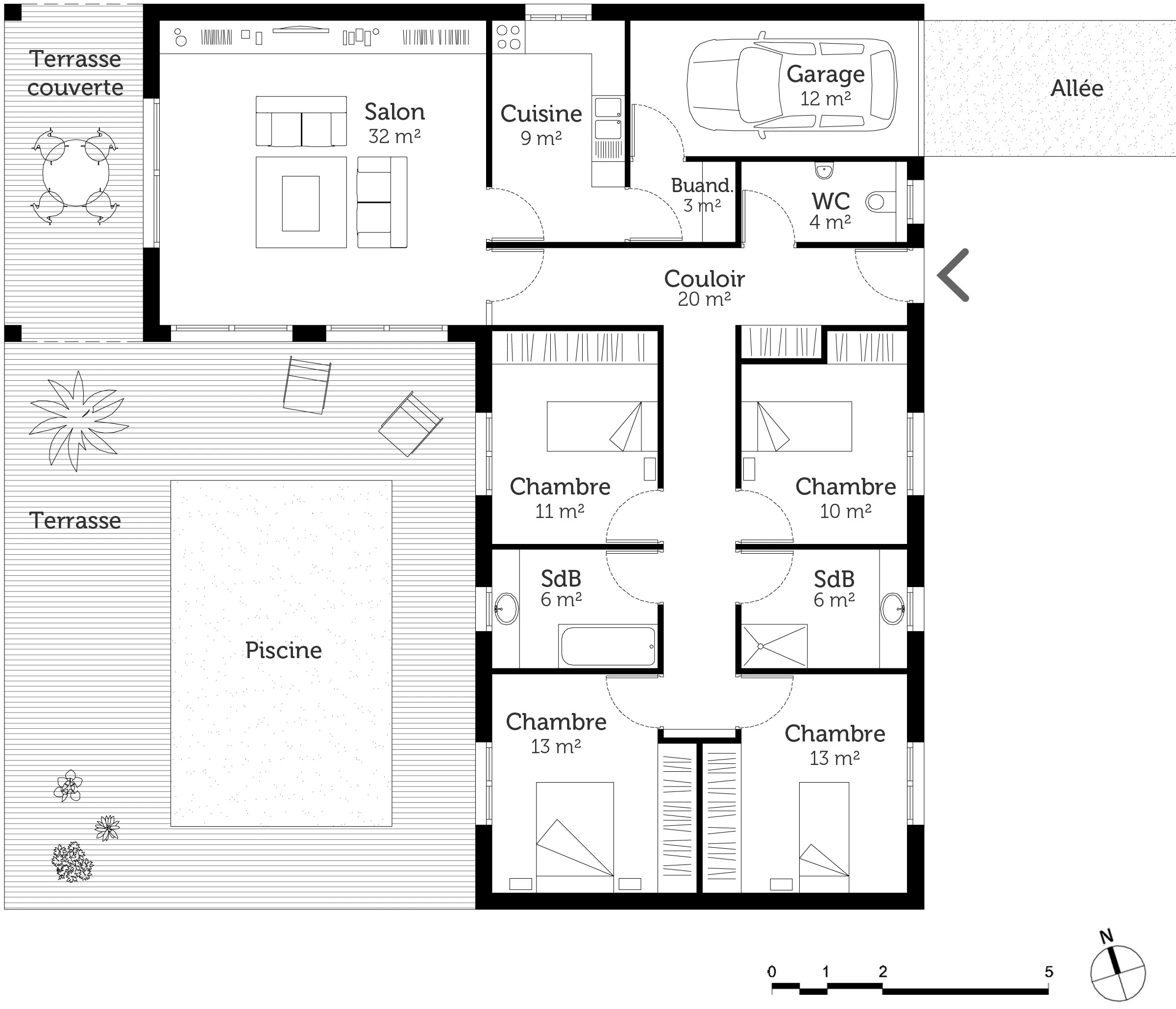 Plan dune maison moderne de 4 chambres. Intimite confort et luminosite sont reunis dans ce modele de maison plain pied. A la maniere des maitres artisans du moyen age la recherche est a lexcellence et se met au service de pieces uniques realisees dans les regles de lart. Maison ossature bois france foret architecte constructeur maison bois pour la construction plan modele et sur mesure bois bbc et passif moderne contemporaine toit plat terrasse cubique modulaire en ile de france 78 yvelines 91 essonne 92 hauts de seine 93 seine saint denis 94 val de marne 95 val d oise 77 seine et marne 27 eure 28 eure et loire. Maison moderne 4 chambres.